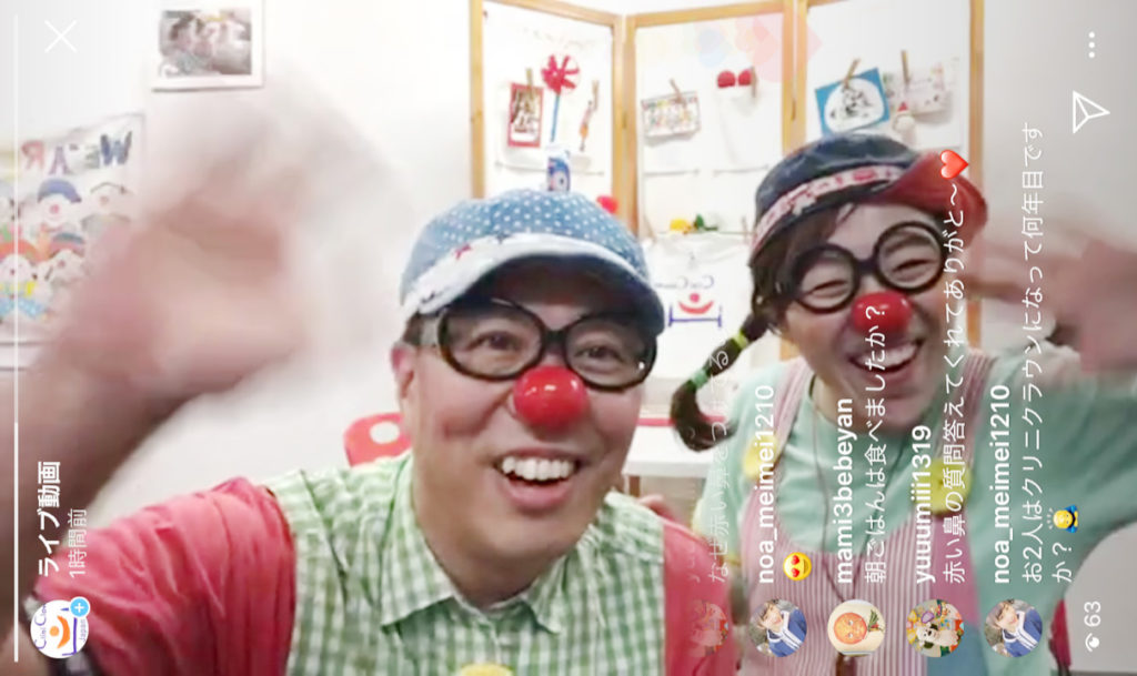 インスタグラムのライブ配信機能を使い、クリニクラウンがライブを配信します。(配信後24時間閲覧可能。第1回配信は2020年5月5日実施 )