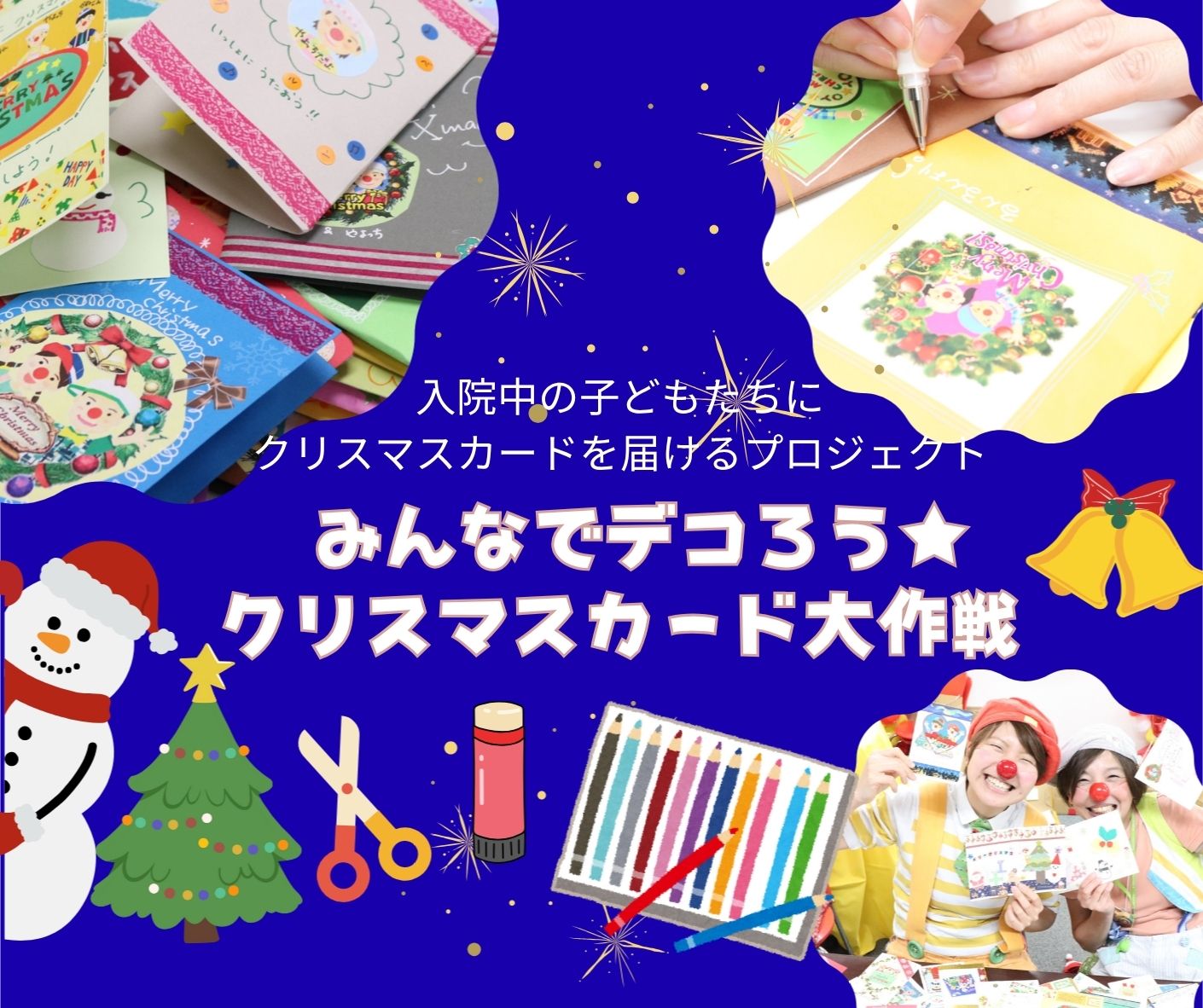 ロハスフェスタ万博2025秋での活動紹介&啓発ブースボランティア募集 2025.10.14 お知らせ 入院中のこどもたちにクリスマスカードを届けるプロジェクト~みんなでデコろう★クリスマスカード大作戦~ 2025.10.7 クリニクラウンWeb事業チャリティイベントで応援 こどもが入院する時の「付き添い」とは〜これまでの付き添い研究のまとめと付き添い環境改善事例紹介〜 2025.10.6 おうちにあるシールやマステで こどもたちに笑顔を🎁 クリスマスカードづくりに使うシール・マスキングテープを募集中! 2025.10.6 チャリティイベントで応援欲しいものリストで応援 「一緒に応援してくれている」という実感が勇気をくれる存在 マルホ株式会社 2025.8.15 インタビュー:日本クリニクラウン協会 河 敬世 理事長に聞く「全国へ、そして沖縄から──“こども時間”が広がる未来を願って」 2025.7.1 20周年記念特別クリニクラウンジャーナル スタート! 2025.7.1 クリニクラウンになりたいあなたへ~ 先輩クリニクラウンからのメッセージ~【クリニクラウンポリタン】 2024.11.25 「こども×あそびフェスタin茨城」レポート 2025.3.25 クリニクラウン,報告・レポート クリスマスカードプロジェクト2024【レポート】 2024.12.25 クリニクラウンWeb事業,クリニクラウンレポート,チャリティイベントで応援 入院中のこどもたちを応援するクリニクラウンわくわくワークショップ(沖縄県)開催レポート 2024.12.13 クリニクラウンレポート 「入院中のこどもたちを応援するクリニクラウンわくわくワークショップ」沖縄レポート 2024.8.2 報告・レポート