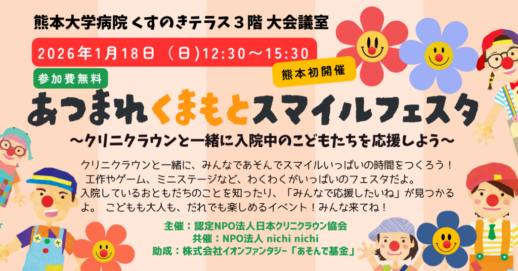 「あつまれくまもとスマイルフェスタ~クリニクラウンと一緒に入院中のこどもたちを応援しよう~」を開催します。