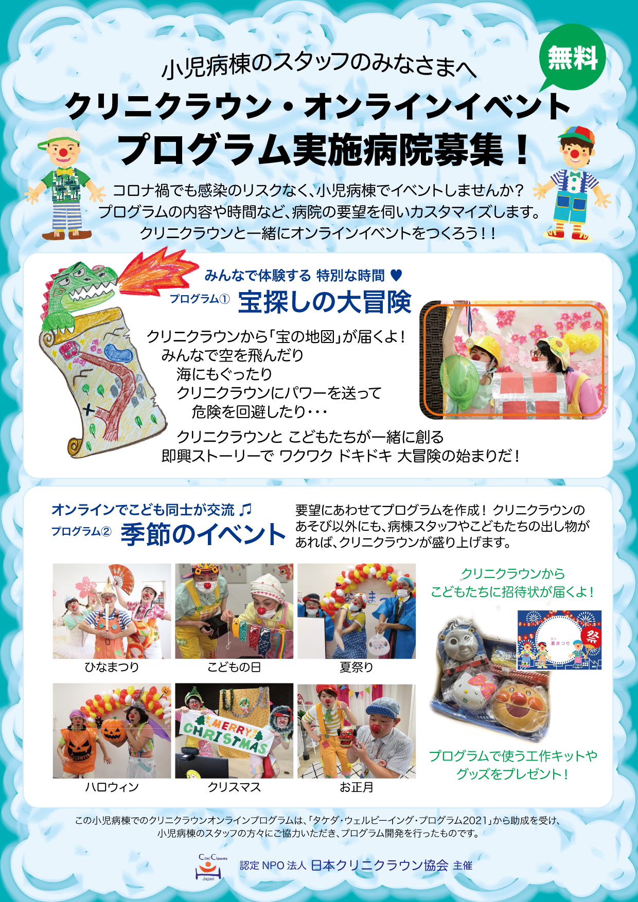 【2022年7月6日作成 2023月1月更新 2023年4月更新 2024年5月更新】 小児病棟のスタッフのみなさまへ コロナ禍でも感染のリスクなく、小児病棟でイベントを実施しませんか? プログラムの内容や時間など病院の … 続きを読む 小児病棟でのクリニクラウン・オンラインイベントプログラム実施病院募集中!【2024年度無料実施)】